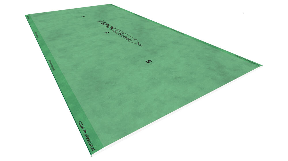 Nida HYDRO Mini 12.5 is an additivated plasterboard with reduced water absorption in the core. The surface and longitudinal edges are covered with a special cardboard. The upper face is green.