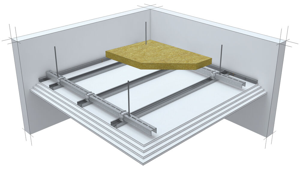 Suspended ceiling with quadruple-layer cladding on UA/CD double profile structure, mounted with threaded rods.